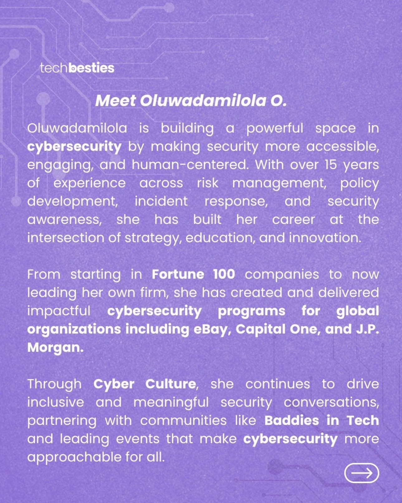 Tech Besties featured Cyber Culture in its 2026 Women’s History Month Cyber Bestie series, highlighting our Founder & CEO, Oluwadamilola O. The feature spotlights how Cyber Culture is redefining the cybersecurity industry through a more human-centered, inclusive, and accessible approach by facilitating meaningful security conversations, partnering with communities like Baddies in Tech, and leading impactful cybersecurity events.